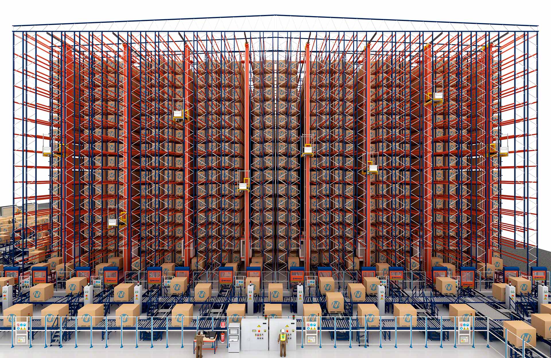 - Solução integral: A Mecalux projeta, fabrica, instala e coloca em funcionamento todos os componentes do armazém automático, desde estantes, transelevadores e transportadores até softwares de controle e de gerenciamento.