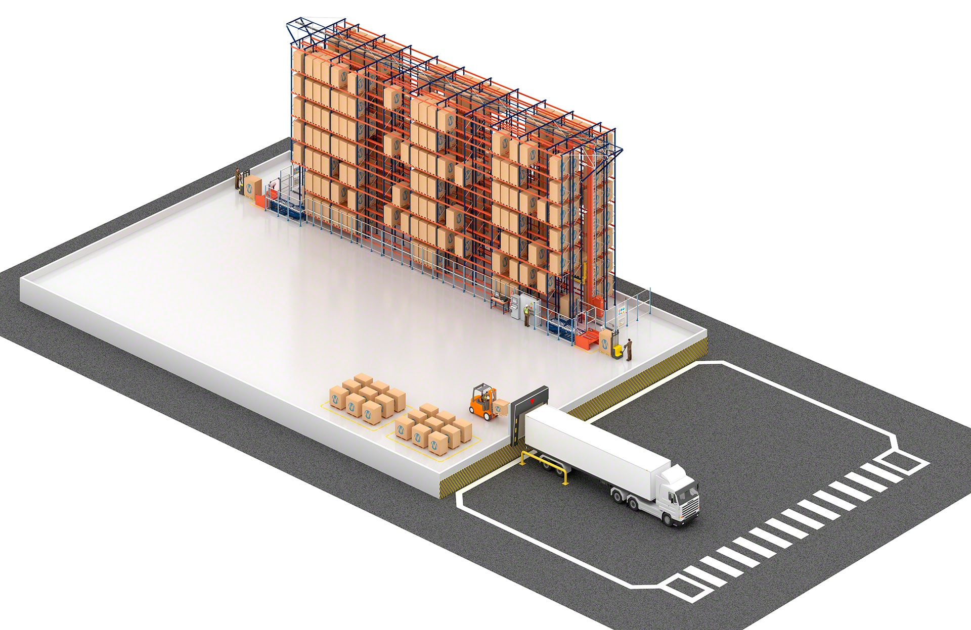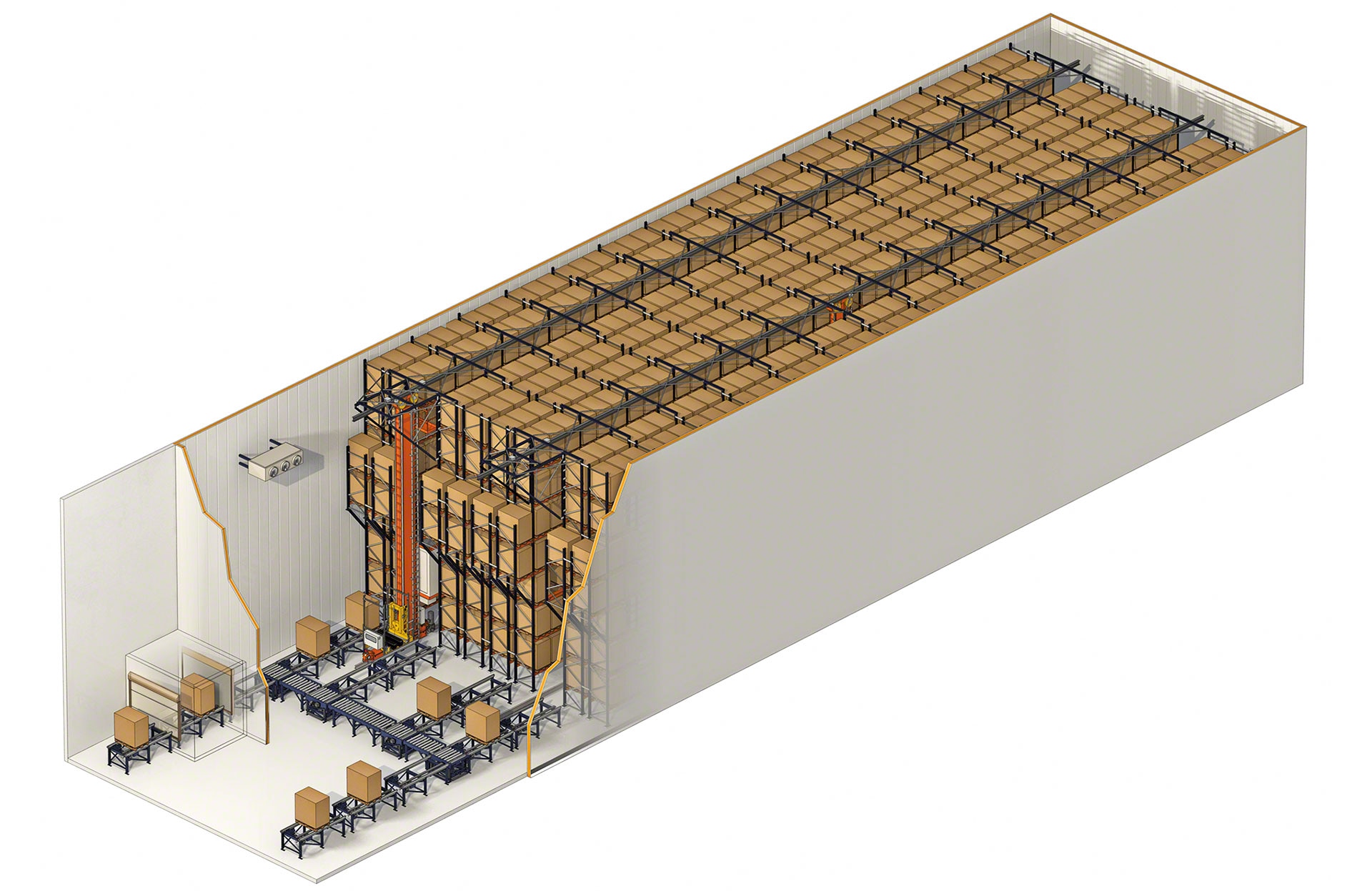 Sistema de armazenamento projetado para depositar e extrair paletes de forma totalmente automática, o que potencializa a produtividade e aumenta a capacidade do armazém.
