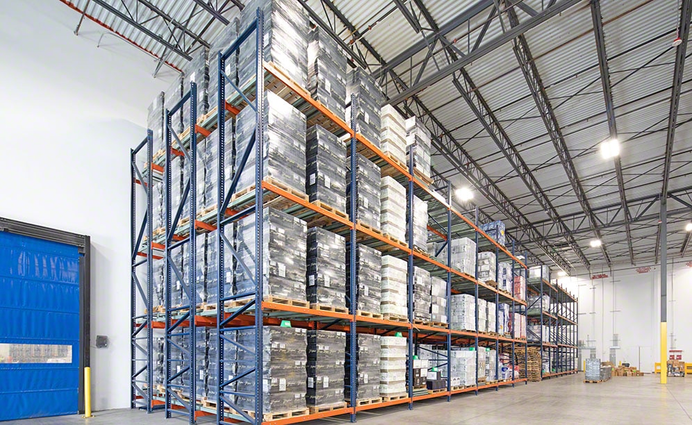 As estantes push-back também foram instaladas por duas razões: para acessibilidade do produto e, porque fornecem uma capacidade de armazenamento ideal ao otimizar a superfície. As estantes são compostas de canais com uma leve inclinação onde até cinco paletes podem ser depositados em profundidade. A frente está em uma altura mais baixa de modo que, ao remover um palete, os posteriores avançam por gravidade para a posição inicial. Como resultado, proporcionam muita agilidade no manuseio das mercadorias, já que as manobras dos operadores são mínimas.
