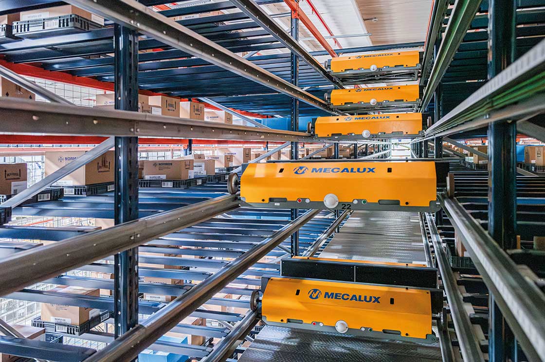 O Sistema Shuttle de Normon é uma solução de armazenamento projetada para picking massivo: inclui 46 lançadeiras que movimentam caixas em estantes de profundidade tripla com capacidade para 22.000 unidades. As caixas, armazenadas em bandejas de 400 x 400 mm, são gerenciadas de forma totalmente automática. Essa tecnologia permite que os operadores se concentrem na preparação de pedidos enquanto o sistema cuida da reposição.