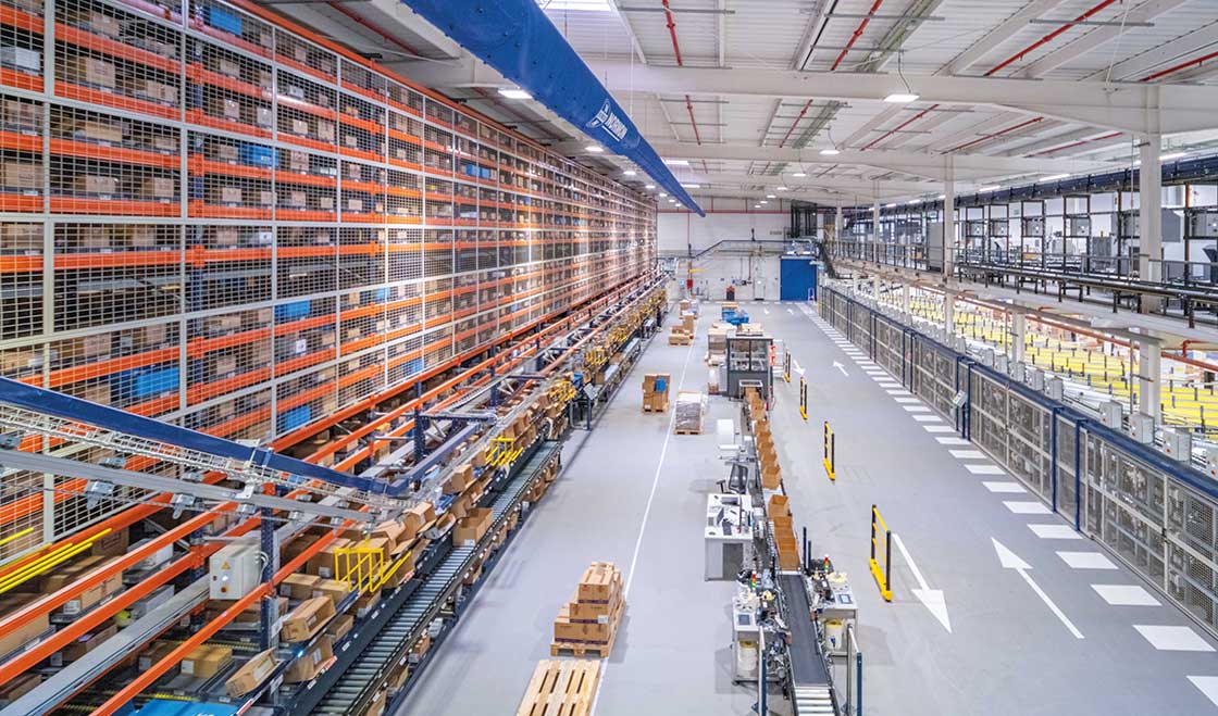 No centro deste sistema encontra-se uma área de picking distribuída por dois níveis. Ali, os operadores, guiados por pick-to-light extraem caixas dos 272 canais dinâmicos de profundidade tripla, garantindo disponibilidade contínua e evitando interrupções na preparação dos pedidos. Em seguida, as caixas são inseridas no sistema de transportadores para caixas, que as direciona tanto para a área de expedições quanto para o Sistema Shuttle.