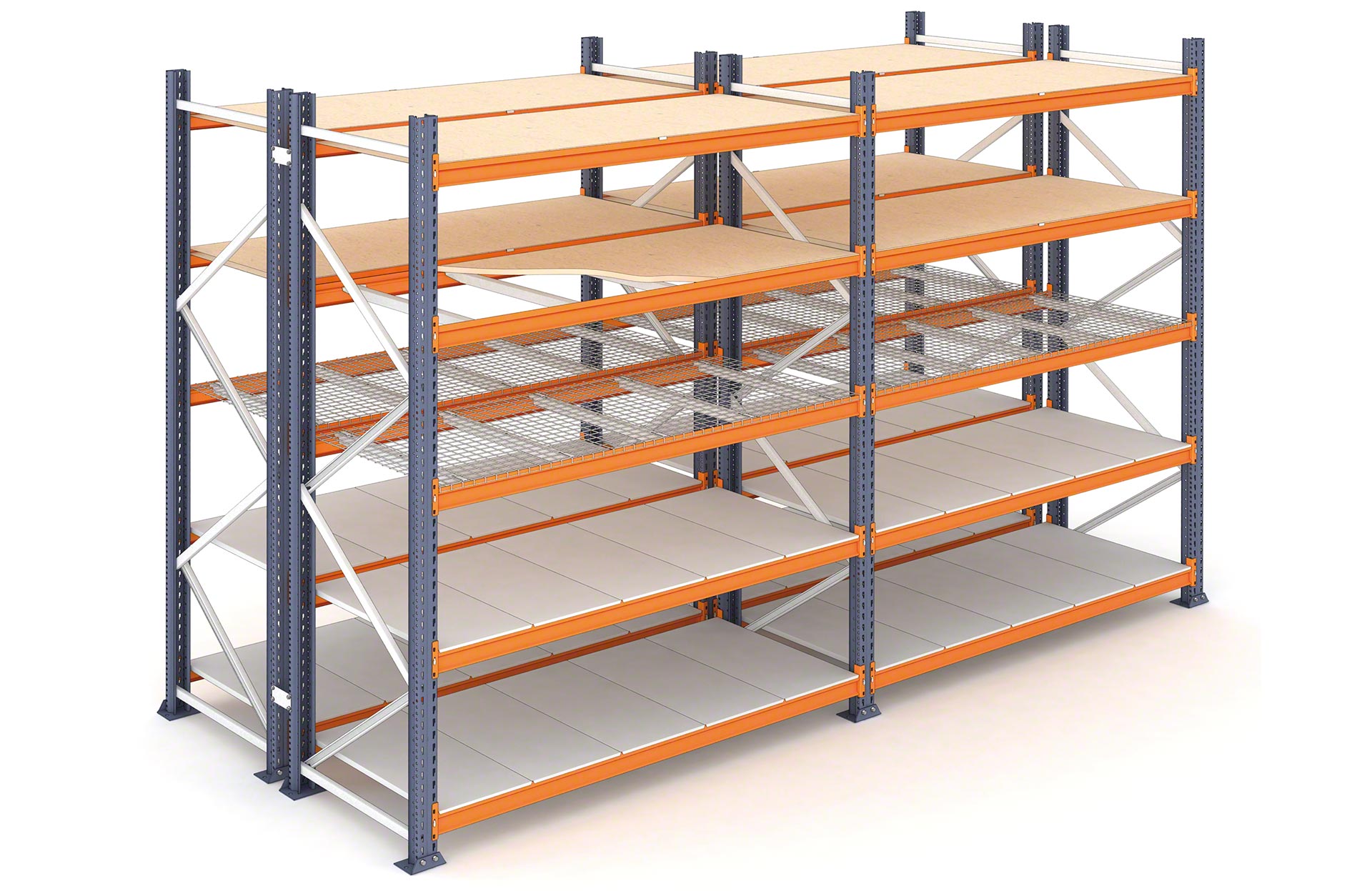 As prateleiras configuram as superfícies planas nas quais se deposita a mercadoria nos diferentes níveis de armazenagem. Apoiadas sobre longarinas ou suportes, são oferecidas em diferentes materiais e acabamentos.