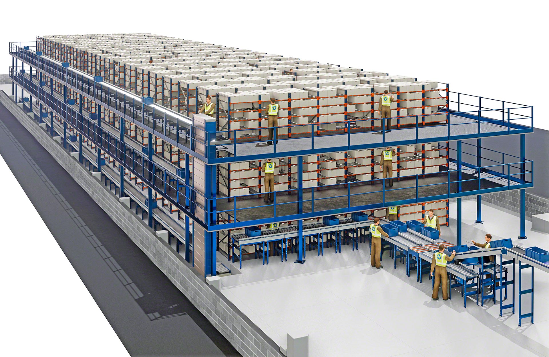 Sim. Os mini porta pallets M55 podem ser instalados em alturas de até 20 m. Nas instalações cuja altura não ultrapasse os 12 m, o acesso aos níveis superiores pode ser feito com máquinas selecionadoras de pedidos. Por outro lado, se a altura ultrapassar os 12 m, é necessário montar um sistema de corredores elevados para ter acesso aos níveis altos.