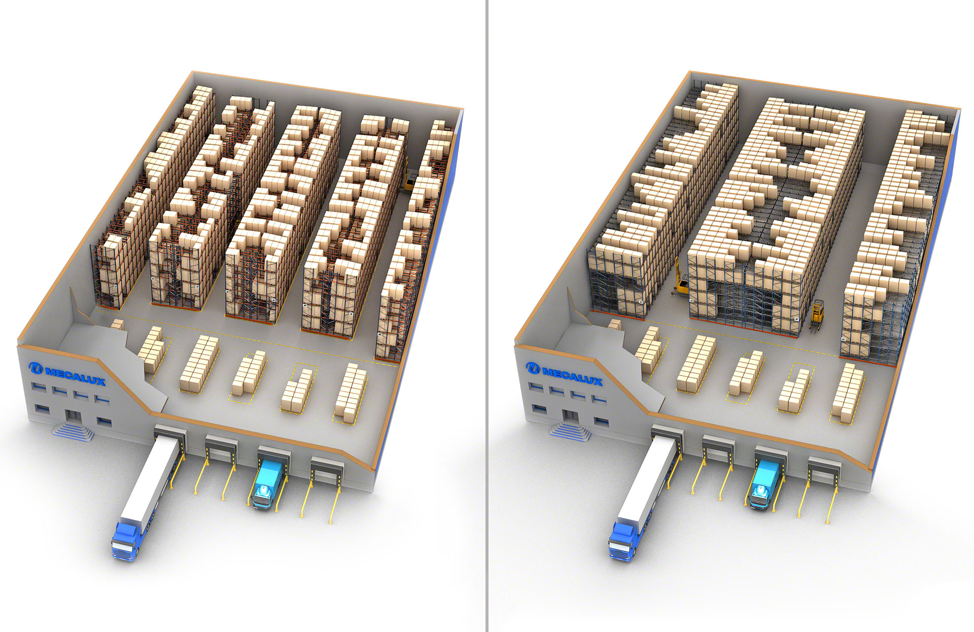 - Economia de espaço: a eliminação de corredores intermediários favorece um maior aproveitamento da superfície disponível e aumenta a capacidade de armazenamento.